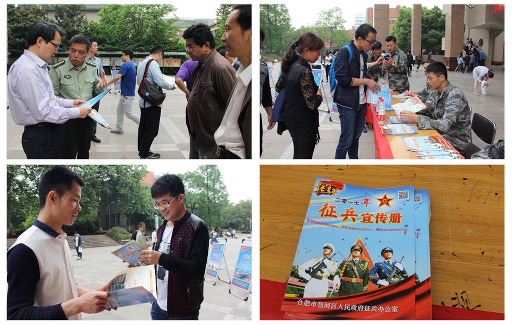 4月25日,根据合肥市包河区征兵办及包河区人武部的统一部署,我校在东区师生活动中心广场举行2017年度大学生征兵宣传咨询活动。本次活动由包河区人武部、芜湖路街道武装部和学校人武部联合主办。