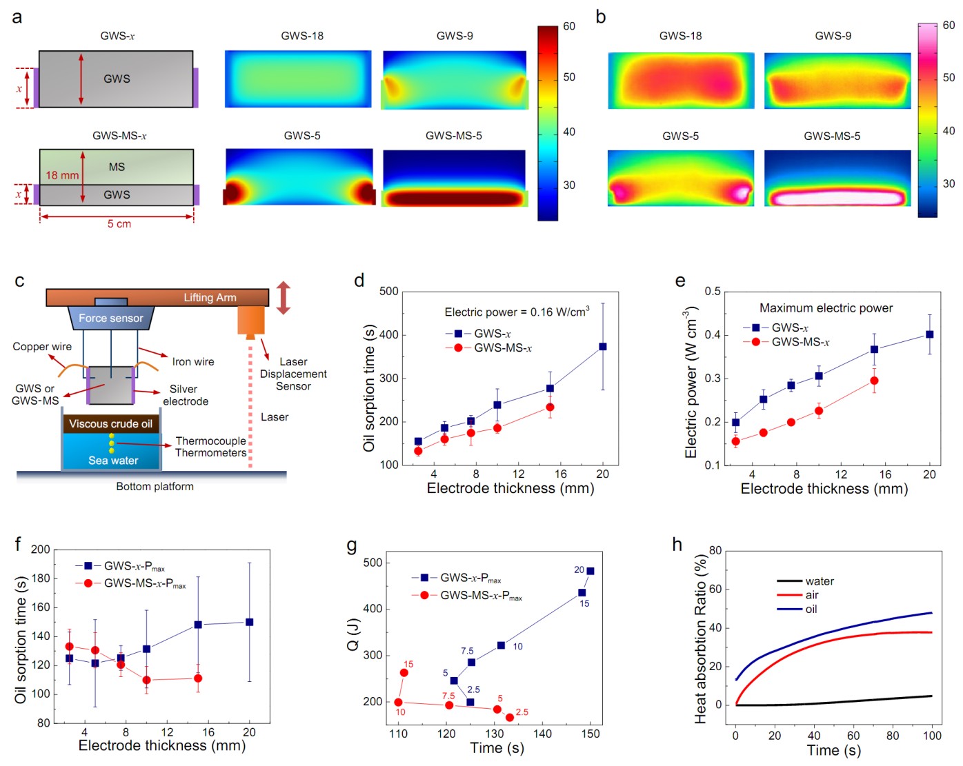 图三:石墨烯海绵温度分布场对电能利用效率的影响。a. 具有不同电极结构(GWS-x)和石墨烯涂层(GWS-MS-x)的石墨烯修饰的海绵,在相同通电功率下的温度分布场模拟计算结果。b. 与图a相对应的实验结果。c.石墨烯修饰的海绵吸油速度测试装置示意图。d.在相同输入电功率密度下,电极结构和石墨烯涂层的分布对石墨烯修饰的海绵吸油速度的影响。e.具有不同电极结构和石墨烯涂层的石墨烯修饰的海绵所能承受的最大通电功率。f.加热区域厚度调控。g. 不同温度场的石墨烯修饰的海绵的吸油时间同输入电能的关系。h.石墨烯修饰的海绵(GWS-MS-10-Pmax)吸油过程中的热量传递模拟计算结果。