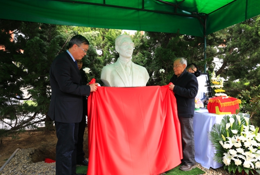 在郭永怀和李佩先生合葬仪式上,力学所郑哲敏院士、力学所秦伟所长共同揭碑。“一对伉俪,两种传奇;怀瑾佩瑜,师表后继”的碑文赫然在目。集体默哀后,两位先生的骨灰合葬在塑像下。最后大家在塑像前鞠躬致敬,向两位先生献花以表哀思。