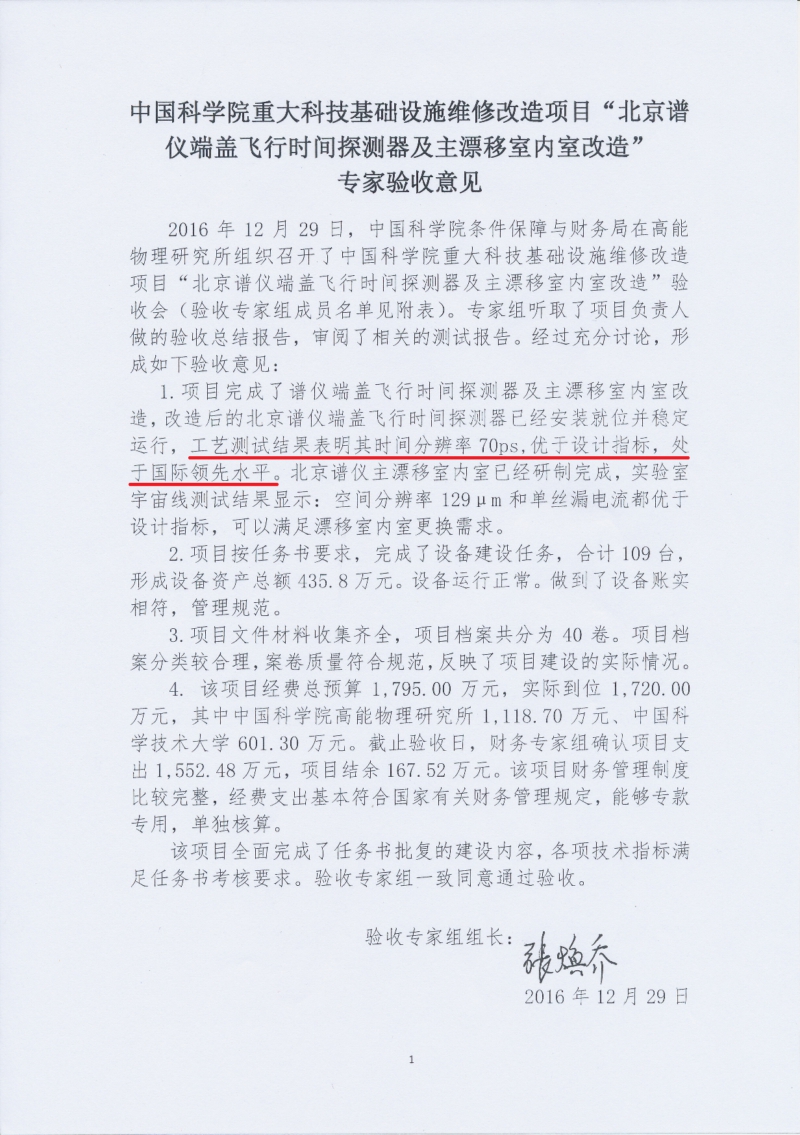 专家组经过讨论,形成验收意见:“项目完成了谱仪端盖飞行时间探测器及主漂移室内室改造,改造后的北京谱仪端盖飞行时间探测器已经安装就位并稳定运行,工艺测试结果表明其时间分辨率70ps,优于设计指标,处于国际领先水平”。专家组认为,“该项目全面完成了任务书批复的建设内容,各项技术指标满足任务书考核要求。验收专家组一致同意通过验收。”