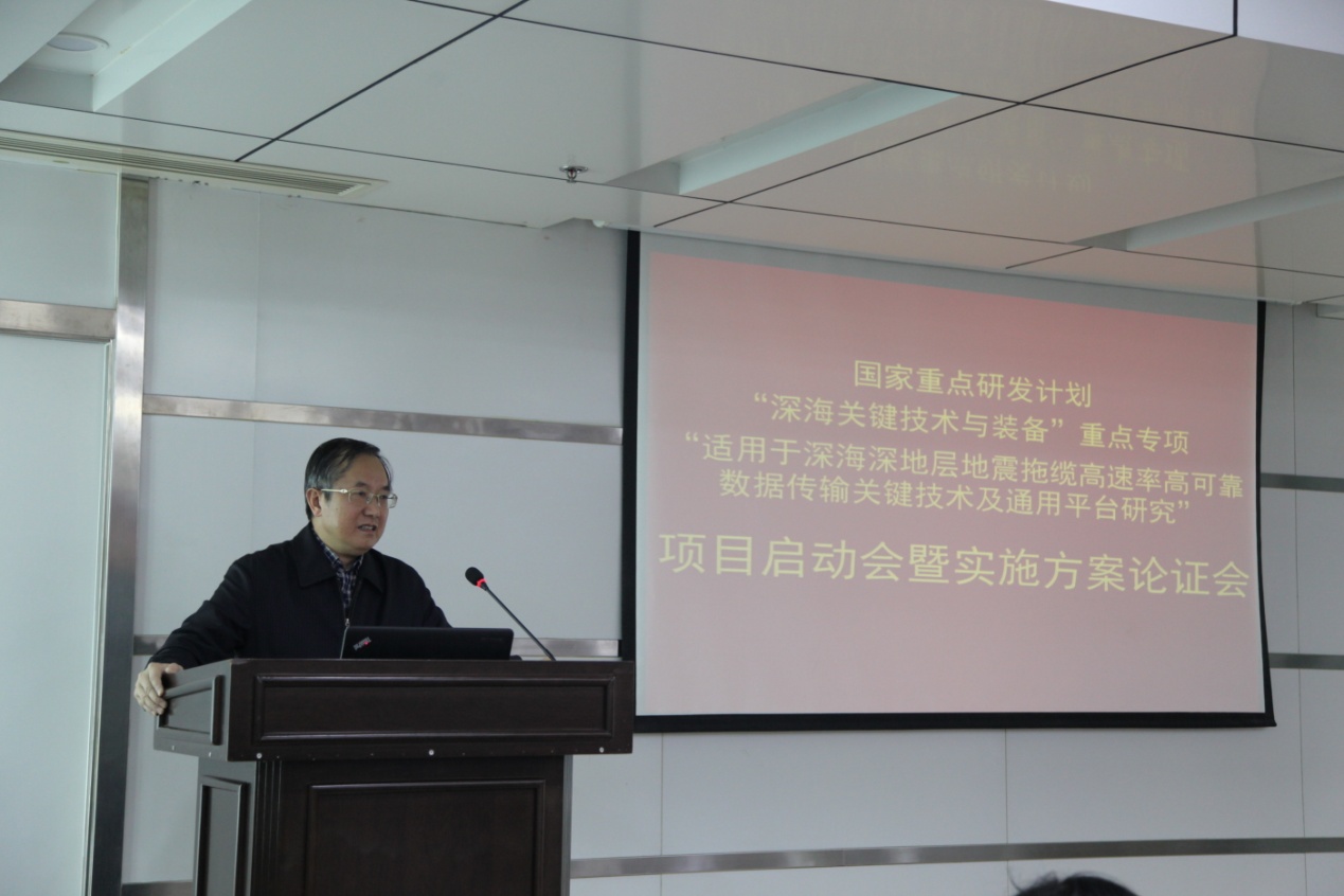 周先意副校长在致辞中向出席会议的专家、参研单位的代表表示热烈的欢迎和衷心的感谢,对宋克柱教授牵头承担“深海关键技术与装备”重点专项项目表示祝贺,希望项目组按照任务书的要求开展研究工作,按时按质完成研究任务。韩鹏副研究员强调深海神妙莫测、充满挑战,希望学校和项目合作单位密切协作,克服困难,研制出实用化的产品,为实现国家深海战略多做贡献。杜江峰院士、赵政国院士分别代表物理学院和核探测与核电子学国家重点实验室表示将全力支持该项目实施。项目合作单位中海油田服务股份有限公司和中船重工第七一五所表示将保证按时、按节点完成项目任务书规定的目标。