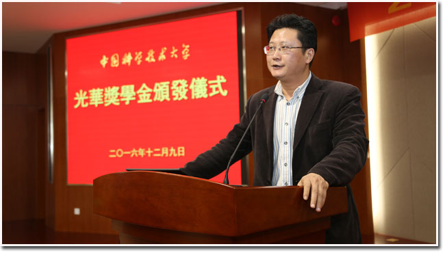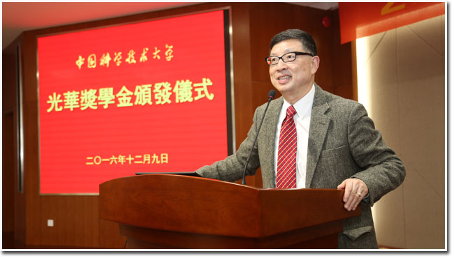 蒋一代表学校对光华教育基金给予我校人才培养工作的大力支持表示衷心感谢。蒋一表示,习近平总书记考察中国科大时指出,我们要有自信。要道路自信、理论自信、制度自信,还有一个根本的自信,就是文化自信。中国传统文化的核心价值观礼、义、仁、智、信反映到当下蓬勃发展中的中国就是要求同学们养成爱国、敬业和诚信的优良品质。希望同学们要以获得光华奖学金为契机,争做发扬中华文化的表率,秉承科大精神奋发努力,追求卓越科教报国,为国家和社会的发展进步作出更大的贡献。