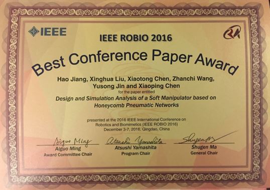 近日,中国科大计算机学院陈小平团队运用气动蜂巢网络软体执行器在软体机器人研究领域取得重要进展,发展了气动蜂巢网络软体执行器的一种新的设计和分析方法。相关成果以Design and Simulation Analysis of a Soft Manipulator based on Honeycomb Pneumatic Networks为题在2016 IEEE International Conference on Robotics and Biomimetics 报告并获得大会唯一的最佳论文奖(Best Conference Paper Award)。