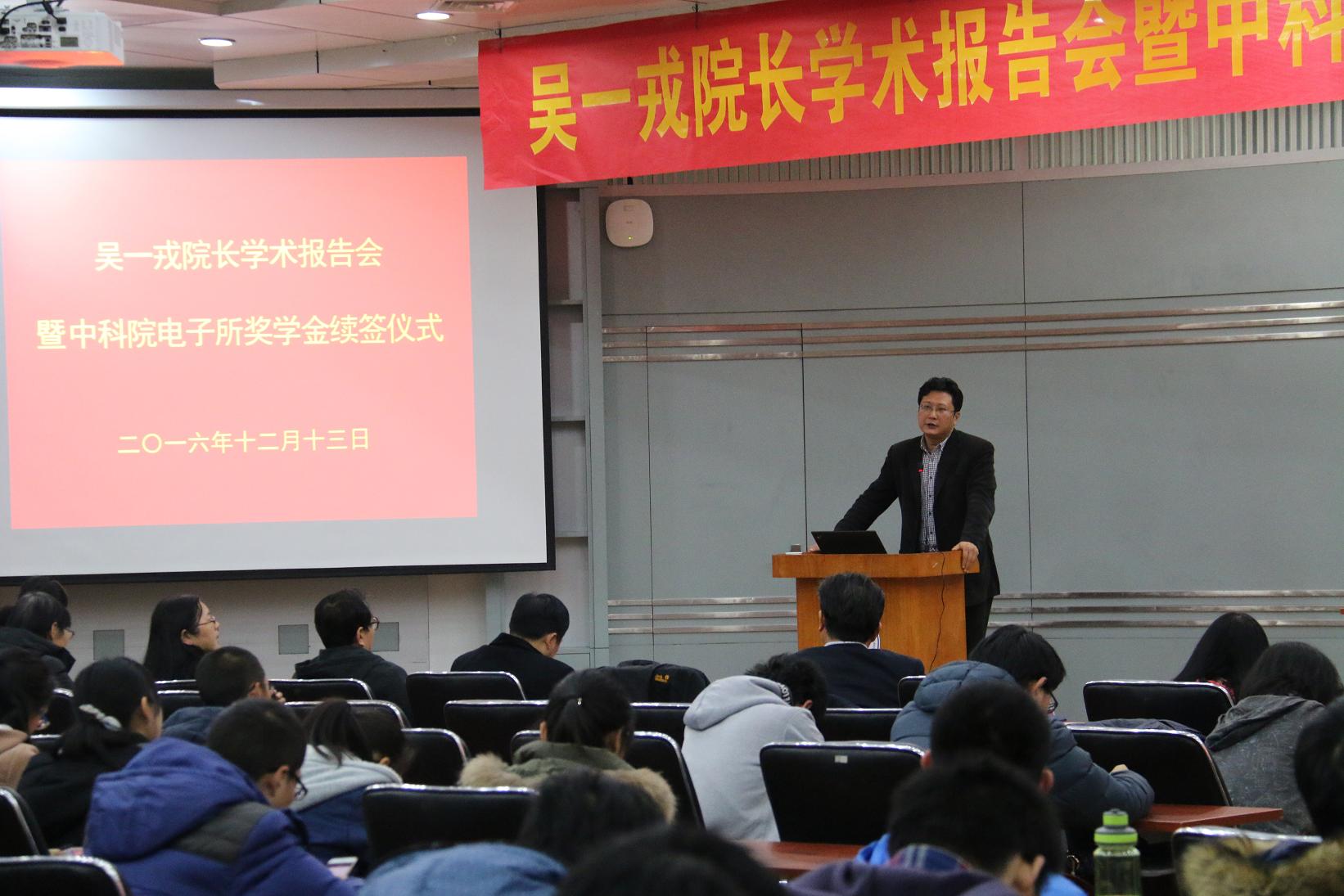12月9日下午,吴一戎院士学术报告会暨中科院电子所奖学金续签仪式在西区活动中心学术报告厅隆重举行。中国科学院电子学研究所所长、信息科学技术学院院长、中国科学院院士吴一戎、校党委副书记蒋一、中科院电子所以及我校信息学院、少年班学院、物理学院的相关领导、老师也出席了此次活动。续签仪式及学术报告会由信息学院党委副书记王童主持。