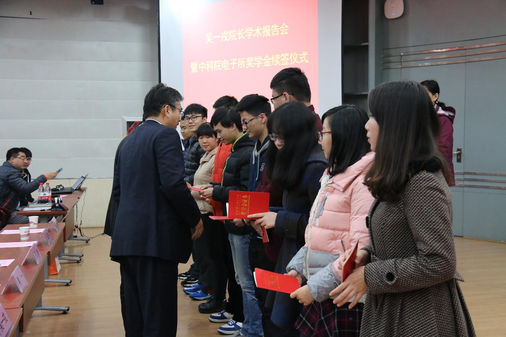 活动开始,由蒋一副书记致欢迎辞。他回顾了学校与中科院电子所的合作历程,他表示,电子所通过在我校设立冠名奖学金并开展信息科技英才班等一系列合作,充分体现了“全院办校,所系结合”的办学方针。此次奖学金协议的续签,不仅对同学们是一种鼓舞和激励,也意味着我校和电子所之间的合作进一步巩固加深。希望获奖同学继续保持和发扬成绩,锐意进取,再接再厉,争取更大进步;也希望其他同学能够以他们为榜样,严格要求自己,勤奋学习,全面发展,为把自己培养成社会需要的高素质人才而努力奋斗。