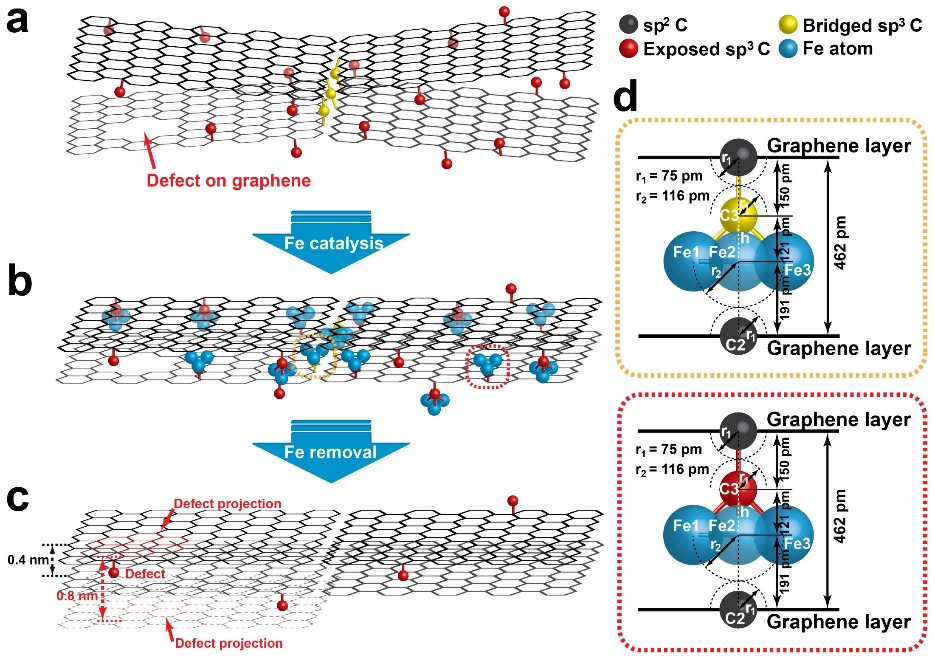 图2.Fe3+催化改性的酚醛基碳气凝胶的孔道结构形成机理示意图。(a) 传统硬碳中石墨片层微观结构;(b) Fe3+与sp3碳反应生成众多单个Fe3C团簇;(c)Fe3+催化改性后石墨片层的重排结构;(d)两个石墨片层之间形成Fe3C团簇示意图及片层间距尺寸计算。