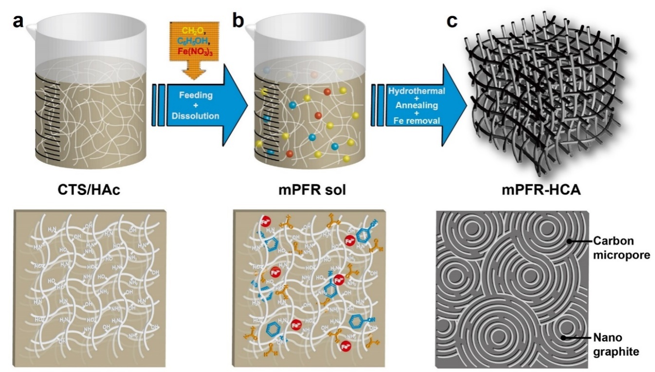 图1. 壳聚糖分子链作为三维软模板合成PF/Fe碳气凝胶。(a)壳聚糖溶液;(b)酚醛树脂络合Fe3+溶胶;(c)催化改性后的碳气凝胶及其微观结构。