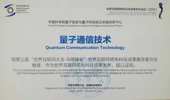 11月16日,第三界世界互联网大会在浙江乌镇召开。此次大会首次发起了“世界互联网领先科技成果”发布活动,我校成果“量子通信技术”入选。