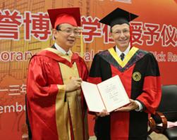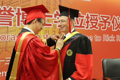 张淑林副校长宣读国务院学位委员会《关于同意授予里克·雷斯特名誉博士学位》的文件后,侯建国校长向里克·雷斯特颁发了名誉博士学位证书并为其配戴中国科学技术大学校徽。