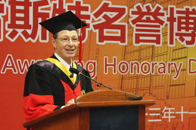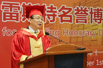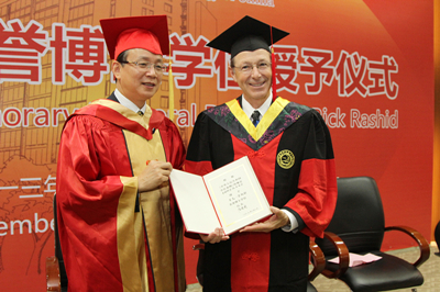 侯建国校长在致辞中高度评价了里克·雷斯特教授为计算机科学的发展以及创新人才培养所作出的重要贡献。他说,中国科大非常荣幸授予里克·雷斯特教授名誉博士学位,此后我们又多了一位闻名世界的校友。中国科大之前授予的三位名誉博士都是自然科学领域的杰出学者,里克·雷斯特教授是中国科大授予的第一位工程技术领域的杰出学者。他希望里克·雷斯特教授一如既往地支持微软亚洲研究院和中国科大的紧密合作,继续推动中国科大在高新技术领域的前沿研究和人才培养,携手将双方的合作推向一个新台阶。