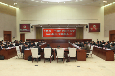 11月11日下午,合肥市与中国科大2013年度市校联席会议在合肥市政务中心召开。省委常委、市委书记吴存荣,市长张庆军出席会议并讲话。会议由中国科大党委书记许武主持,校长侯建国在会上作中国科大及先进技术研究院创新发展工作通报。