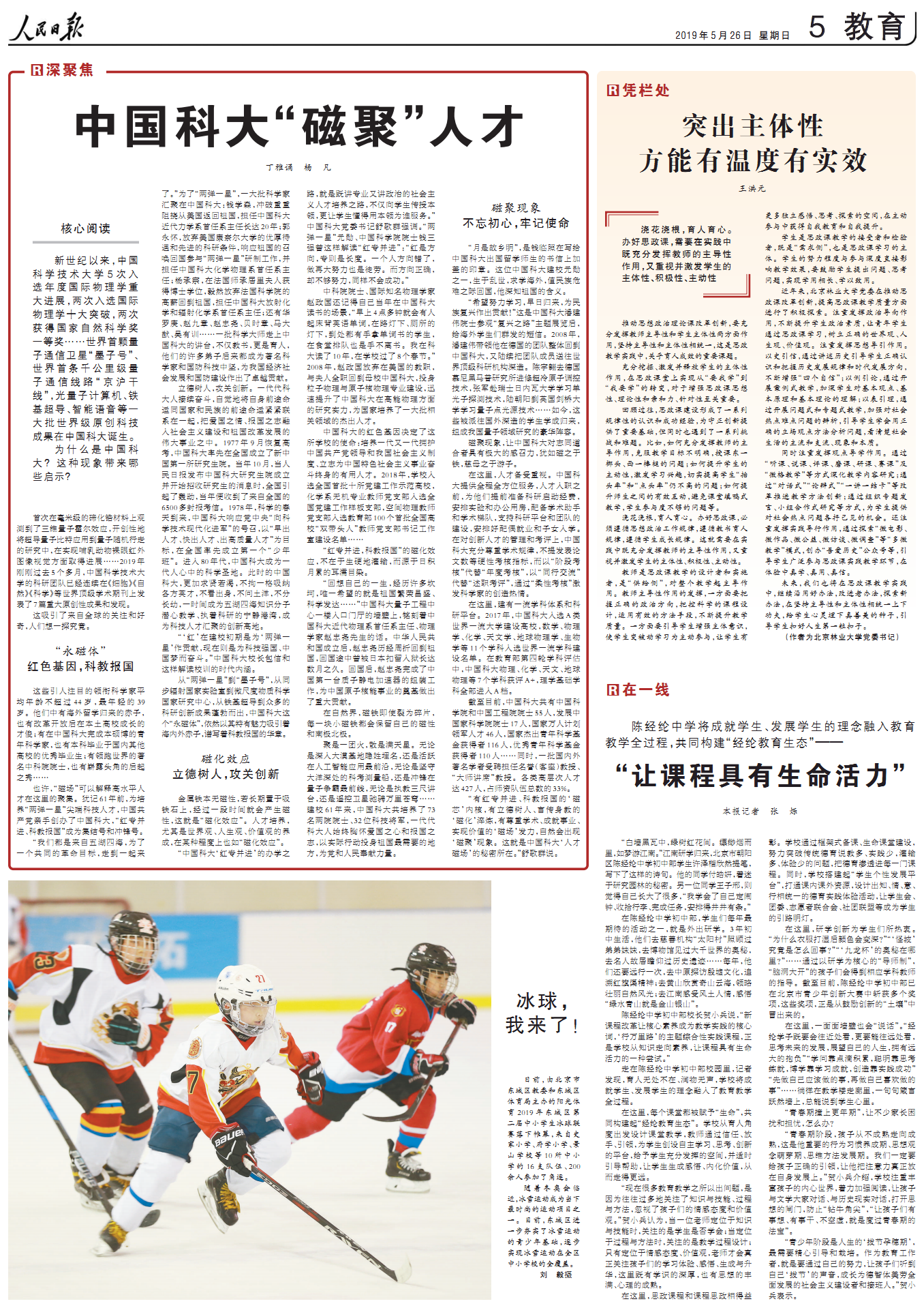 编者按:2019年刚刚过去5个月,中国科学技术大学的科研团队已经在《细胞》《自然》《科学》三大世界顶级学术期刊上发表了7篇重要原创性成果,引发广泛关注。2019年5月26日,人民日报在教育版头条位置深度聚焦中国科大,刊发了题为《中国科大,“磁聚”人才》的通讯报道。文章以自然界的磁现象为比喻,分别从“永磁体”、磁化效应、磁聚现象的视角,解读了中国科大人才聚集、成果迭出的深层次原因,以历史纵深感的笔触,彰显了中国科大“红专并进,科教报国”的红色基因和办学底色,呈现了一代代科大人“潜心立德树人,执着攻关创新”的接续奋斗历程,展现了科大师生和广大校友“建功立业新时代”的精神风貌。