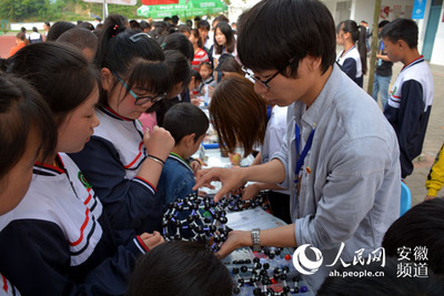人民网合肥5月13日电(汪瑞华 杨凡)“背诵课文就能让机器蜘蛛跑起来,越专心,蜘蛛跑得越快!”5月12日,中国科学技术大学把科普活动送到了扶贫点。当天上午的金寨县燕子河初级中学操场上,一只通过“意念头箍”控制的机器蜘蛛让不少农村娃大开眼界。
