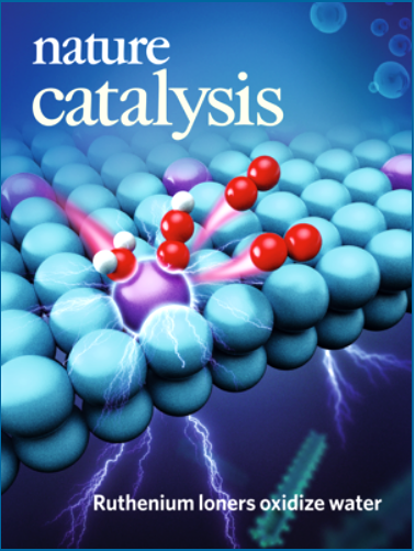 《自然﹒催化》四月刊封面:酸性电解液的环境中,在外加电位作用下,水分子吸附到活性位点单原子Ru上,在单原子Ru的催化下,电解水产生氧气。