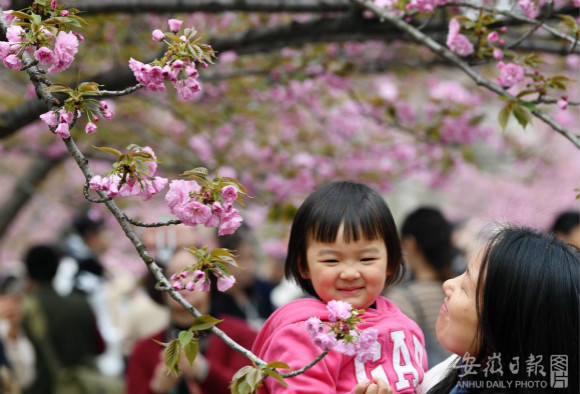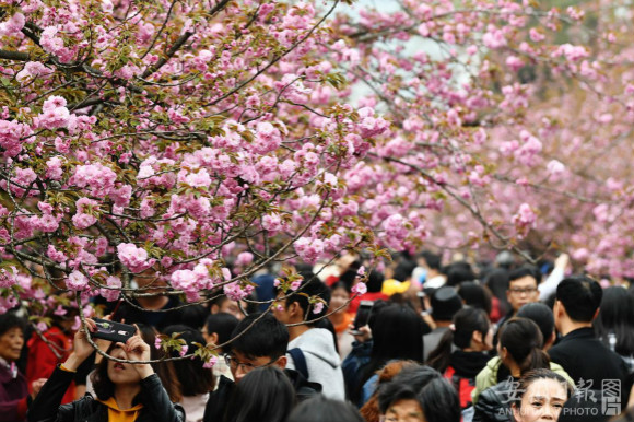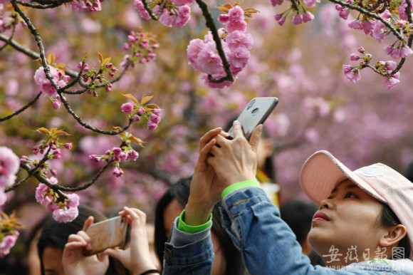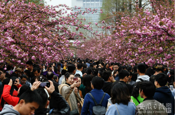3月30日,数万合肥市民来到中国科学技术大学校园观赏樱花。近日,该校100多株晚樱进入盛开期,校园周末及节假日免费向市民开放。 (记者徐旻昊摄)