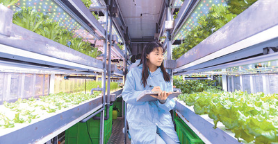 近日,中国科技大学先进技术研究院将光电子技术运用在植物生长上,不需要阳光和土壤就可种植植物,打破了空间、地点、光照等限制。图为11日,科研人员正在实验室观察光照时间。