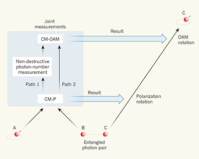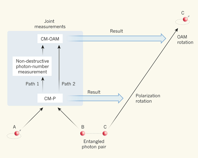 The measurements ultimately result in the transfer or teleportation of A's properties onto C – although it may require rotating C's (as yet unknown) polarization and OAM depending on the outcomes of the comparative measurements, but the researchers did not actually implement the rotations in their current experiment. The team's work has been published in the journal Nature this week. Pan tellsphysicsworld.com that the team verified that "the teleportation works for both spin-orbit product state and hybrid entangled state, achieving an overall fidelity that well exceeds the classical limit". He says that these "methods can, in principle, be generalized to more [properties], for instance, involving the photon's momentum, time and frequency".