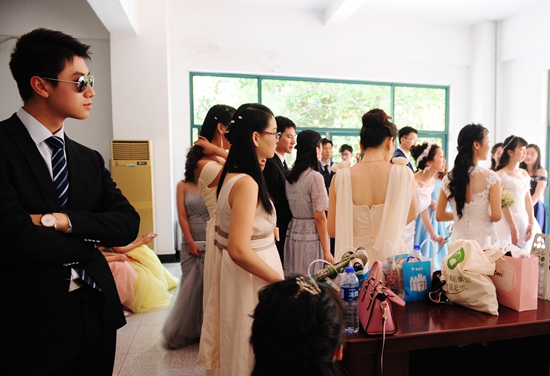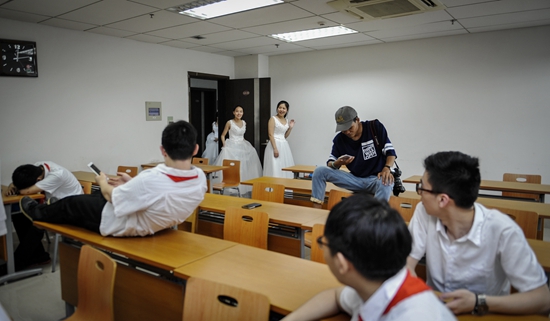 6月11日,安徽合肥,中国科技大学少年班学院创新试点二班,女生换上婚纱走进教室,准备拍摄毕业合影。