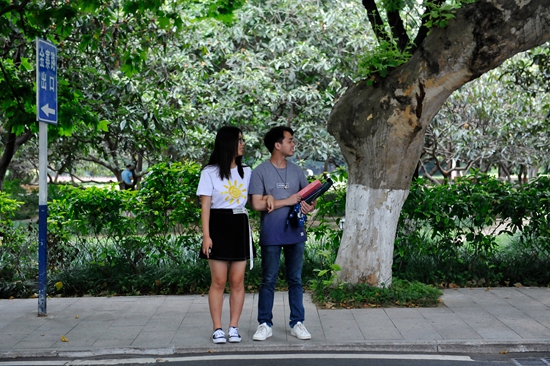 6月20日,少年班学生陈欣怡与特意从北京赶来的男友等待和父母一起离开校园。