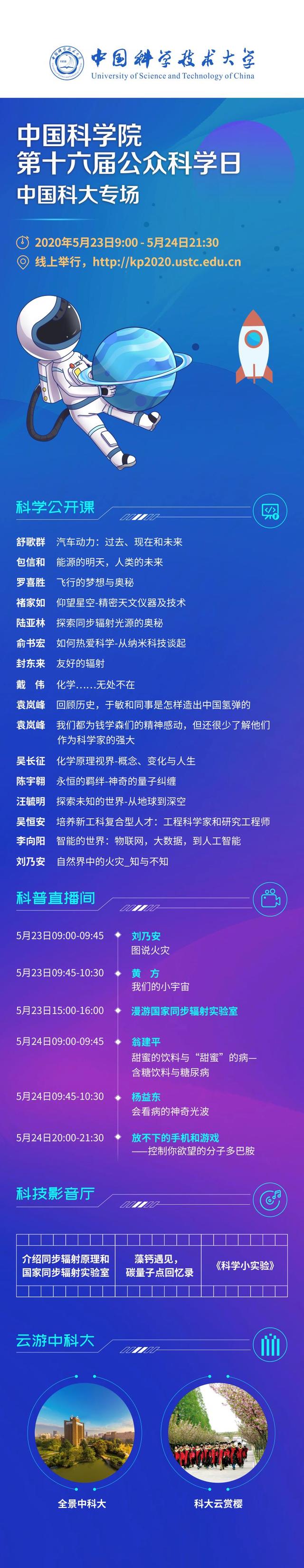 5月23日,中国科学院第十六届公众科学日中国科大专场活动在合肥拉开序幕。中国科大专场活动由科学公开课、科普直播间、云游中科大、科技影音厅等多个版块构成,以全部线上活动形式,全面展现中国科大近年来重大科技创新成果,描绘科技造福人类的美好愿景,激发公众尤其是青少年对科学的关注和兴趣。公众只需登陆网页http://kp2020.ustc.edu.cn/,即可畅游神奇的科学世界。