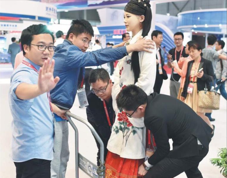 Jia jia, an interacitve robot developed by a research team from the University of Science and Technology of China, makes her exit after the opening ceremony of Expo Central China 2017 on Wednesday. Capable of carrying on basic conversations and showing micro facial expressions, the robot received a warm welcome from spectators. Makeup and accessories helped her to life.