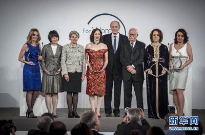 3月18日,中国教授谢毅(左二)在法国巴黎出席2015年度“世界杰出女科学家奖”颁奖仪式。