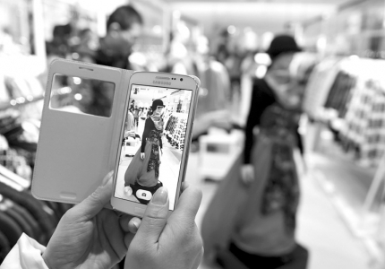 1月13日,顾客在拍摄机器人“可佳”进行导购服务。