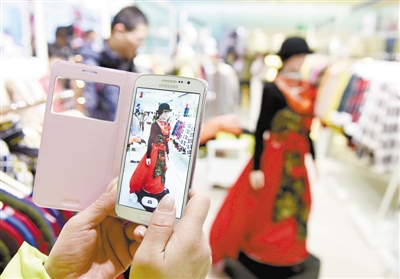 顾客在拍摄机器人“可佳”进行导购服务。 新华社记者 刘军喜摄