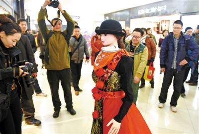 1月13日,机器人“可佳”在商场里引导顾客到指定商铺。当日,由中国科学技术大学自主研制的“可佳”云交互机器人首次进入安徽合肥一家大型商场提供导购服务。据悉,机器人“可佳”借助云平台等先进技术手段,突破了传统人和机器人对话的一对一模式,可同时为不同顾客提供购物咨询和引导服务,标志着“可佳”智能服务机器人研发进入实用化阶段。 新华社发