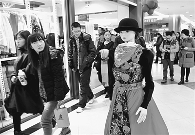 1月13日,机器人“可佳”在商场里引导顾客到指定商铺。
