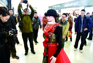 1月13日,机器人“可佳”在商场里引导顾客到指定商铺。