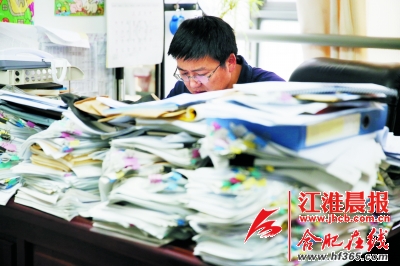 李传锋的办公桌上堆满了各种文档。
