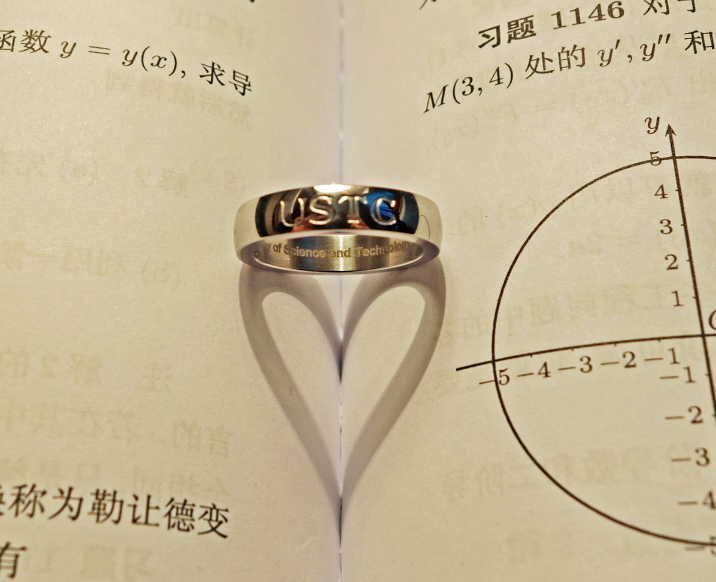 一枚泛、着银光的戒指夹于对开的书页中,即时生成一个唯美的心型倒影。这枚戒指的正面刻着“USTC”(中国科学技术大学的英文缩写),背面刻有编号,还有一张收藏证书,表明了它的独一无二。
