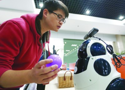 在科大讯飞的一个产品展示台前,已被研发出拥有浅层语义理解能力的讯飞第一代人工智能机器人“小智”,正向前来参观的人群表现自己的能力。科大讯飞总裁办副主任冯涛告诉记者,“从简单的语言听说到可以像人一样理解思考,已经成为科大讯飞在语言方面取得又一个新的战略制高点。”“举一个简单例子,以前科大讯飞的语音系统,当用户对机器提问明天天气如何时,通过语音辨识机器可以提供当天的气温、湿度或者紫外线强度等服务,但如今语音系统再遇到客户天气提问,则可以通过‘明天需要带伞、可以带上防晒霜等’类似大脑神经思考程序回答问题。”