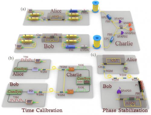 Another result described in the paper is that the novel MDIQKD system's techniques constitute a critical ingredient for a quantum repeater and long-distance quantum communication. "Performing a Bell-state measurement is an intrinsic element in these situations," Zhang points out, because it requires good interference of two independent laser sources. Again, in our work we for the first time have shown the feasibility of this kind of interference, especially at a distance 200 km. Besides the laser modulation techniques, the feedback systems developed for this purpose – for example, time calibration and wavelength calibration – are also of great importance to realizing a long-distance quantum repeater."