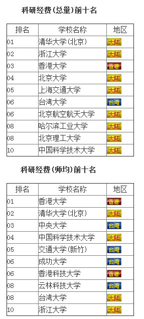 “科研经费”方面,总量前十名中大陆高校共有8所,其中清华大学(北京)以近40亿元的数额继续领跑海峡两岸暨香港、澳门高校;但师均“科研经费”前十名中大陆仅3所。