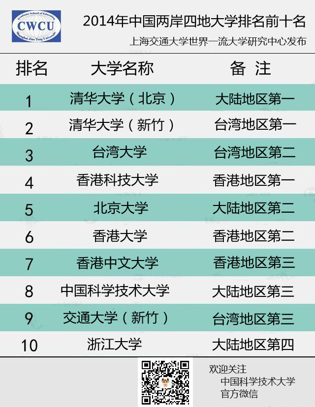 继今年8月发布世界大学学术排名之后,上海交通大学世界一流大学研究中心今日正式发布了2014年“中国海峡两岸暨香港、澳门大学百强排名”,这是该排名自2011年问世以来第四次发布。