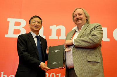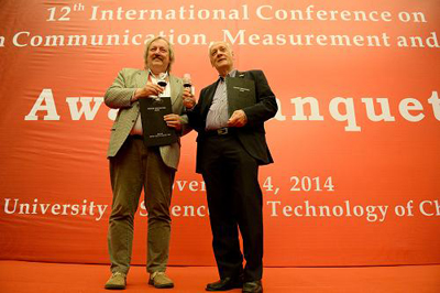 11月4日晚,量子通信、测量与计算国际学术大会(简称国际量子学术大会)组委会在安徽省合肥市将2014年度国际量子通信奖授予瑞士学者尼古拉斯·吉辛和德国学者赖因哈德·维尔纳。国际量子通信奖,自1996年起由国际量子学术大会设立,分为实验奖和理论奖两个奖项,主要授予在该领域做出过杰出贡献的科学家,迄今为止已有20多位科学家获此殊荣。新华社记者 郭晨摄
