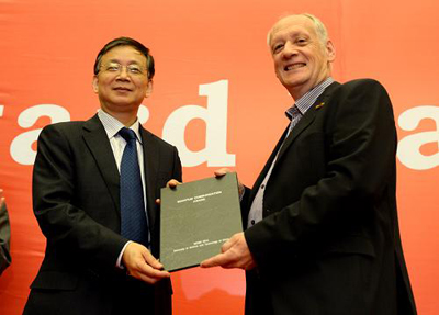 中国科学技术大学校长侯建国(左)向瑞士学者尼古拉斯·吉辛颁发获奖证书(11月4日摄)。