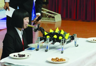 本报讯 (记者胡霈霖/文王志强/摄)昨日,21个厨师机器人和15个助残机器人在中科大2014RoboGame机器人大赛上变身“巧妇”、“暖男”,展示各自的“神技”:摊鸡蛋饼、做回锅肉、喂“渐冻人”吃饭……4000元“封顶”的科研经费,短短几个月的时间,中科大本科生们自主设计、制作、调试出这群机器人,真让人期待“机器人进家庭”的时代早一点到来!