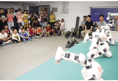 在中国科学技术大学工程科学科普点,小朋友和家长观看机器人表演。(资料图片)新华社发 张端/摄