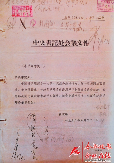 在中国科技大学校史馆,记者见到了这份关系中国科技大学建校的关键性文件——中央书记处会议文件的复印件。文件的左上角有邓小平苍劲有力的批示。