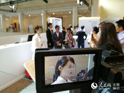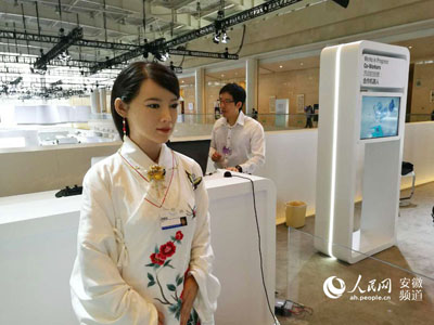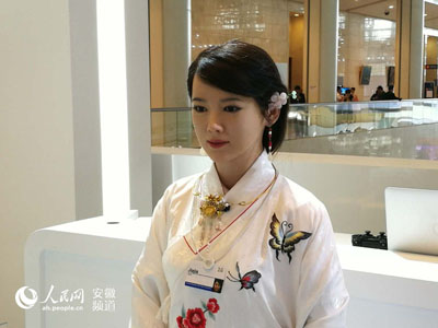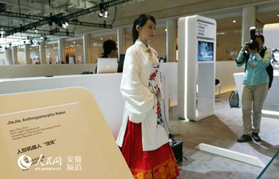 由中科大研发的美女机器人“佳佳”着新装亮相达沃斯论坛(图片由人民网天津频道提供,作者:崔新耀 孙晓川 张静淇)