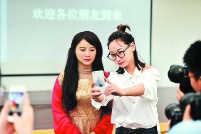 4月15日,在位于安徽合肥的中国科大校园,机器人“佳佳”(左)在接受媒体记者拍照。 新华社记者 刘军喜 摄