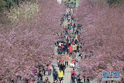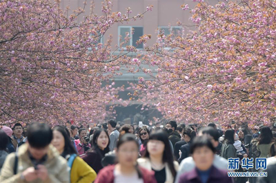 3月27日,在中国科学技术大学东区的“樱花大道”上,游客在观赏樱花。