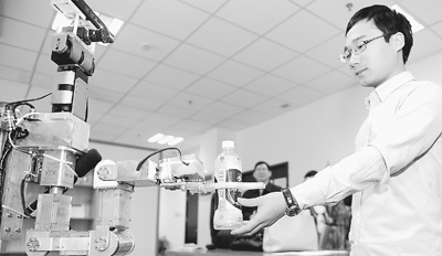 近日,中国科学技术大学智能机器人“可佳”完成了家政服务首秀。图为机器人“可佳” 把“用户”指定的物品交给用户。