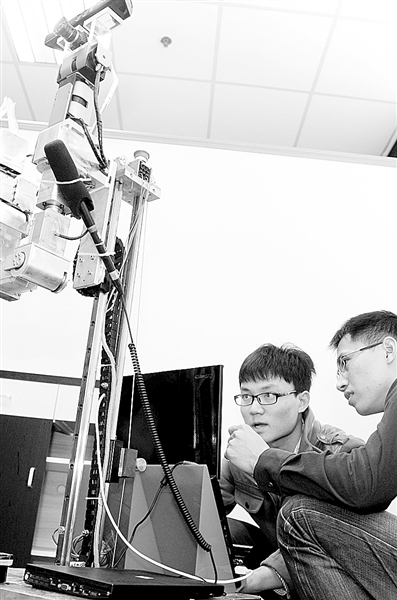 11月15日,工作人员在对机器人“可佳”进行调试。当日,由中国科学技术大学自主研制的“可佳”智能服务机器人进行家政服务的公开演示。机器人“可佳”可识别并记忆用户的外表特征,根据用户的口头指令自动寻找用户指定的物品并交给用户。新华社记者 刘军喜摄