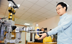 当日,由中国科学技术大学自主研制的“可佳”智能服务机器人进行家政服务的公开演示。机器人“可佳”可识别并记忆用户的外表特征,根据用户的口头指令自动寻找用户指定的物品并交给用户。在整个服务过程中,用户可以自由走动并改变位置和姿态,机器人“可佳”可完全自主地完成任务,不需要人工干预。据悉,中科大“可佳”智能服务机器人的研发为实现机器人保姆梦迈出了重要的一步,“可佳”机器人的自动规划能力也为未来小批量、多批次、按需定制等加工和服务模式奠定了技术基础。