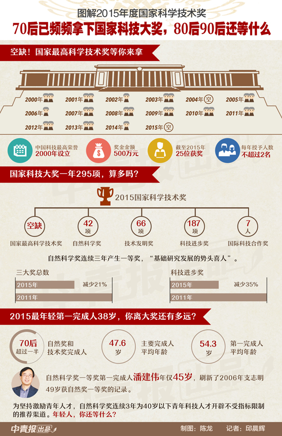 陈志敏说,值得一提的是,从2015年度国家科技奖的结果中可以发现,青年人才开始“冒尖”,并成为引领“双创”的主力军。从整体来看,2015年度国家科技奖获奖项目主要完成人的平均年龄为47.6岁,第一完成人的平均年龄为54.3岁。在自然科学奖和技术发明奖完成人中,70后超过一半。自然科学奖和技术发明奖最年轻的第一完成人都是39岁,科技进步奖最年轻的第一完成人38岁。陈志敏说,这些人活跃在科技创新第一线,不断激发科技创新活力,潜力值得期待。