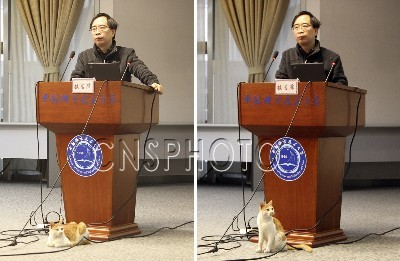 11月12日,中国科学院院士、中科大教授潘建伟在中国科学技术大学东区主持一场报告会,一只猫闯了进来,全程淡定听课、走动、表演、休息,左图为它趴在讲台前,右图为它站起来仿佛想听听老师在讲什么。这只“学术猫”近日火了,它在会场有模有样的现场表演吸引了众多粉丝关注